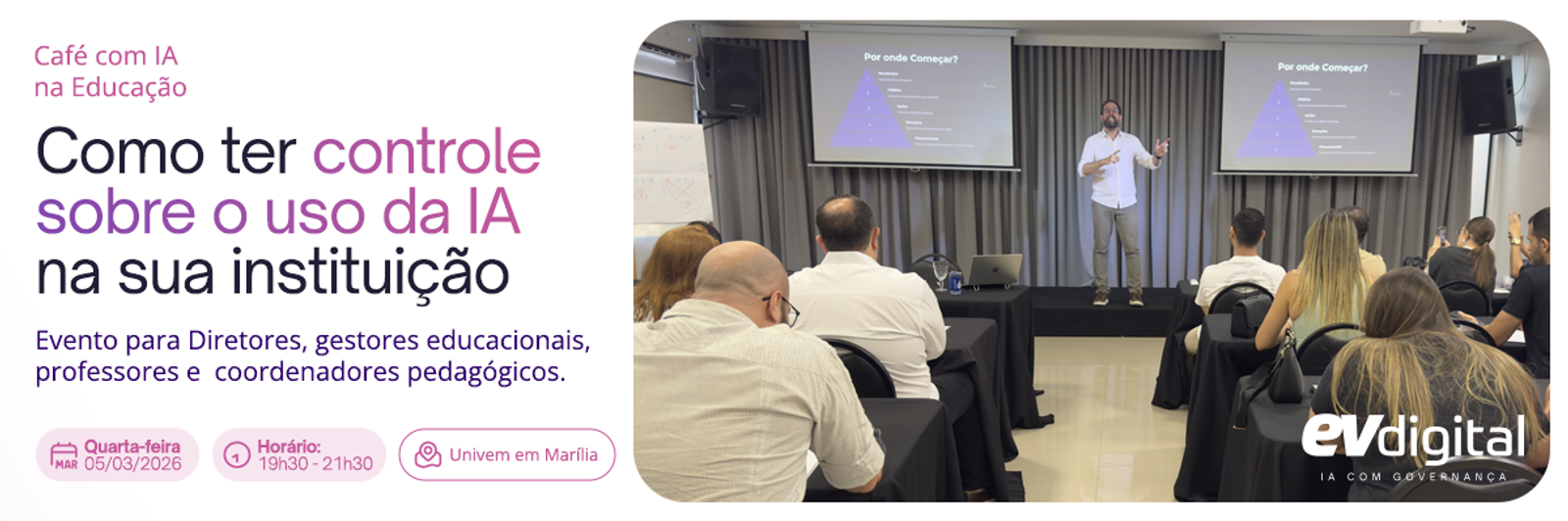 O Café com IA – Educação é um encontro exclusivo para escolas, faculdades e profissionais da área educacional que desejam compreender como estruturar o uso da IA com segurança, controle e direcionamento pedagógico.